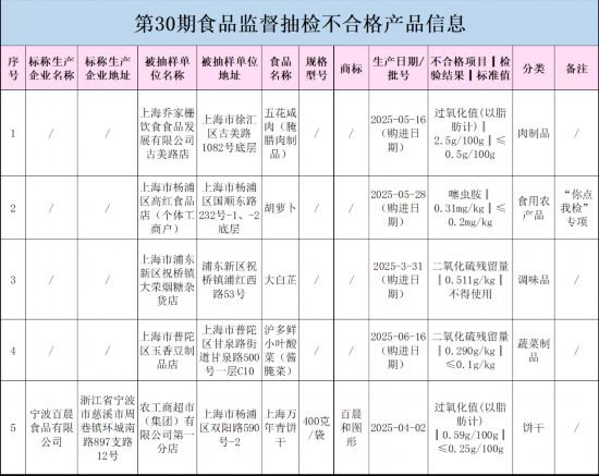 市市场监管局引见,2025年第30期省级食物平安抽检消息发布。本次抽检消息涉及8大类食物,包罗:饼干、肉成品、食糖、蔬菜成品、速冻食物、调味品和饮料。