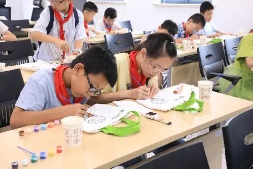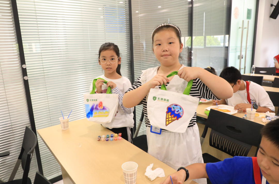 帆布包彩绘环节充满欢声笑语。孩子们为蛋糕、用缤纷色彩注释对健康饮食的理解,一幅幅童趣做品成为难忘的暑期回忆。