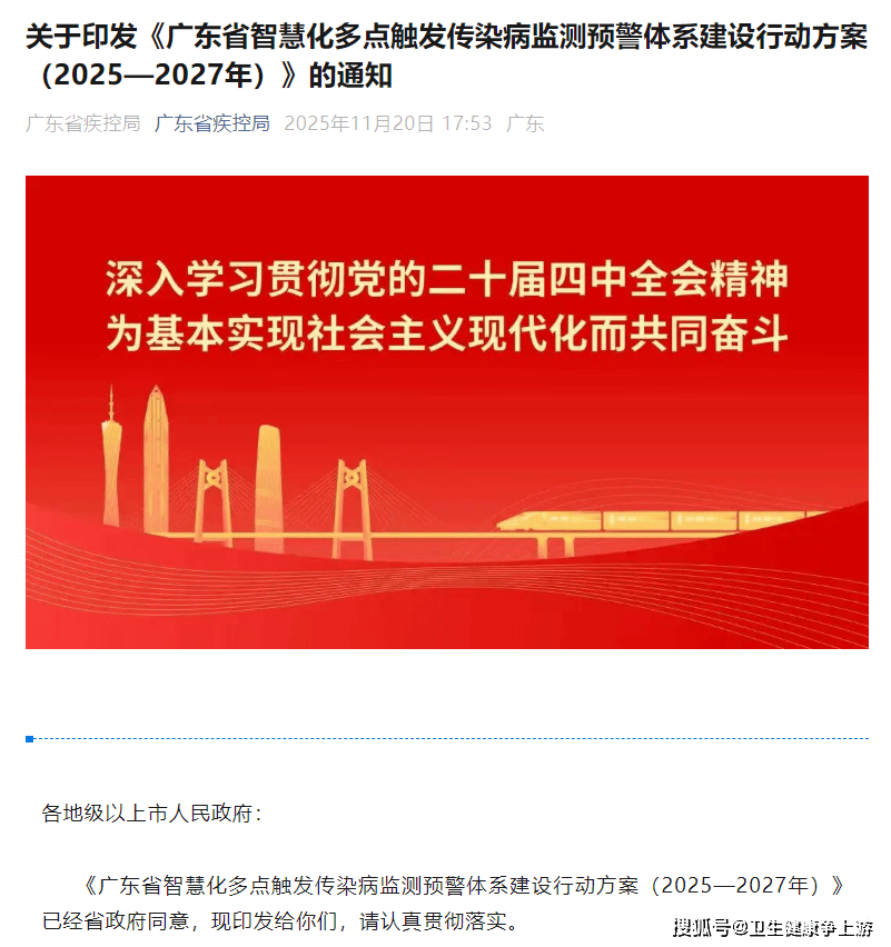 《步履方案》贯彻落实国度疾控局等9部委印发的《关于成立健全聪慧化多点触发流行症监测预警系统的指点看法》(国疾控监测发〔2024〕16号),以及国度和省关于鞭策疾控事业高质量成长摆设要求,进一步推进广东省流行症监测预警系统扶植成长。《步履方案》由省疾控局牵头草拟,普遍收罗各相关单元、地市看法,经省同意,由省卫生健康委、省疾控局、省委网信办、省成长委、省教育厅、省平易近政厅、省财务厅、省农业农村厅、海关总署广东分署等9部分结合印发实施。